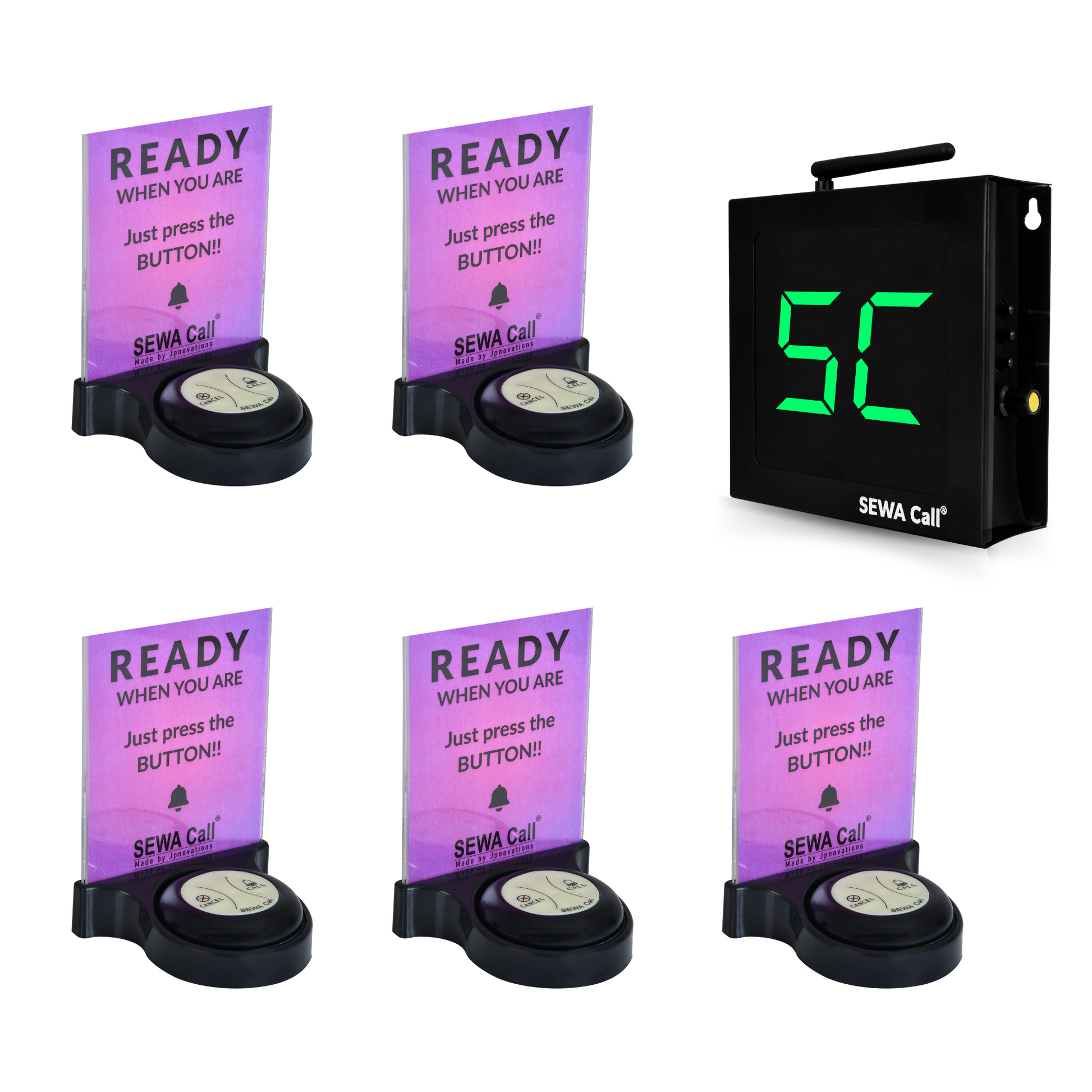 The SEWACall Wireless Table Call System is designed to improve customer service and streamline restaurant or cafe operations. With a simple press of a button, customers can call waitstaff for assistance, ensuring faster service and a smoother dining experience. This system is perfect for any hospitality setting, including restaurants, cafes, hotels, and more. Key Features: - Wireless Convenience: No wires, no hassle! The SEWACall system operates wirelessly, allowing for easy installation and mobility. - Efficient Communication: With a press of the call button, customers can notify the waiter or staff, reducing wait times and enhancing service efficiency. - Durable & Waterproof Call Buttons: The 5 included call buttons are waterproof, ensuring they can withstand spills, humidity, and the rigors of daily use in restaurants and cafes. - Versatile Display: The system comes with a sleek and easy-to-read display that shows the call number and alerts the staff instantly when a customer needs attention